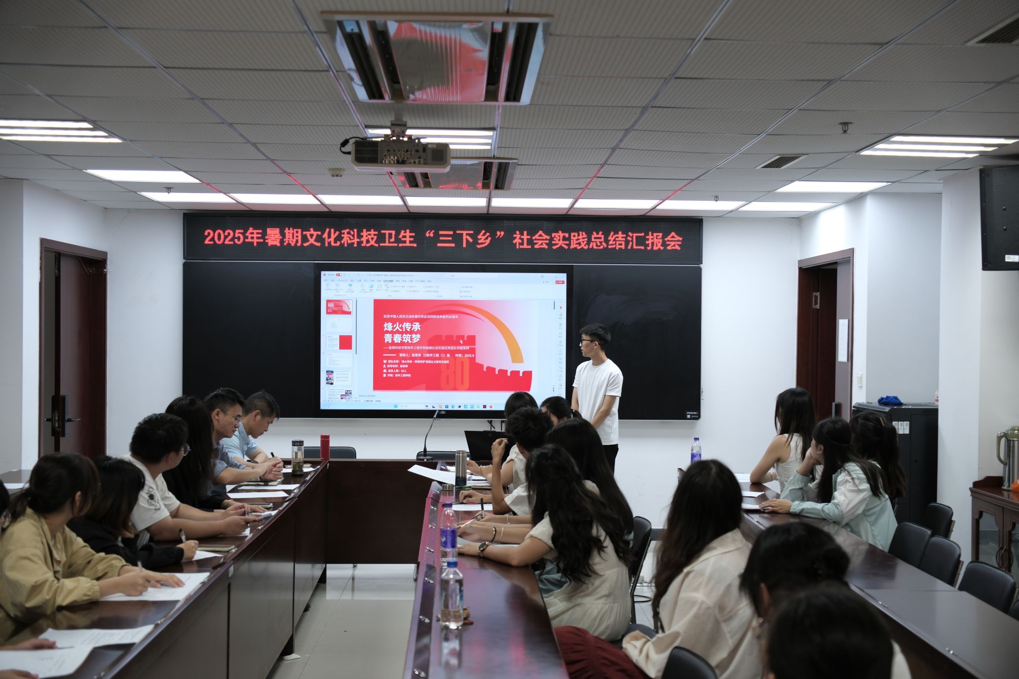 院团总支副书记张议允主持并宣布了评比环节,12支各具特色的实践团队依次上台,通过精彩的PPT汇报展示了他们的实践内容及其成果。“环保乡村调研报告”团队深入乡村一线,聚焦生态环境问题,为乡村的绿色发展建言献策;“炬光寻迹”乡村振兴促进团积极投身乡村建设宣传,探索乡村振兴的多元路径;“南京雨花台社会实践报告”团队与“盐城市新四军纪念馆暑期社会实践报告”团队分别走进红色教育基地,在缅怀革命先烈中汲取精神力量,坚定了理想信念;“烽火传承,青春筑梦”爱国主义实践团和梅园新村纪念馆爱国主义教育团通过系列实践活动,有效激发了团队成员及周围同学的爱国热情;尤为引人注目的是“Deepseek大模型私有化部署夏令营”实践团队,他们将专业所学与社会需求紧密结合,聚焦科技前沿,展现了学院学子扎实的专业技能和勇于创新的精神风貌。